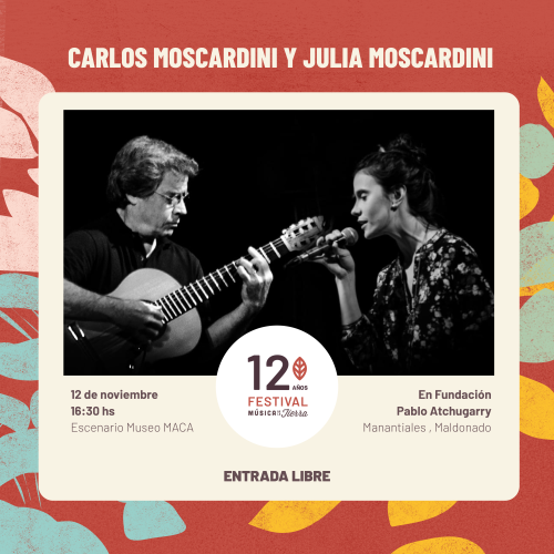 Años después de presentar el disco Délibab junto al brasileño Vitor Ramil, vuelve a Música de la Tierra el gran guitarrista argentino Carlos Moscardini, esta vez con Julia, su hija, cantante de reconocida trayectoria en la escena del jazz con dos discos grabados como solista e integrante de la llamada Big Orchestra que dirige Mariano Loiácono. Juntos interpretarán algunos clásicos del repertorio de la música de raíz folclórica de la región, además de obras para guitarra solista de Carlos Moscardini que ya son referencia de la música argentina para este instrumento en el mundo, y que integran los repertorios de sus tres discos El corazón manda (1997), Buenos Aires de raíz (2005) y Silencios del suburbio (2012). Nacido en Lomas de Zamora, provincia de Buenos Aires, Moscardini actuó en más de veinte países de América, Europa y Asia. La música popular de raíz folclórica y géneros como la milonga, la zamba, la chacarera, la guaraña o el vals criollo, son parte de su territorio creativo.